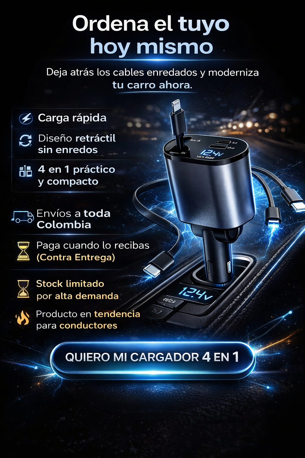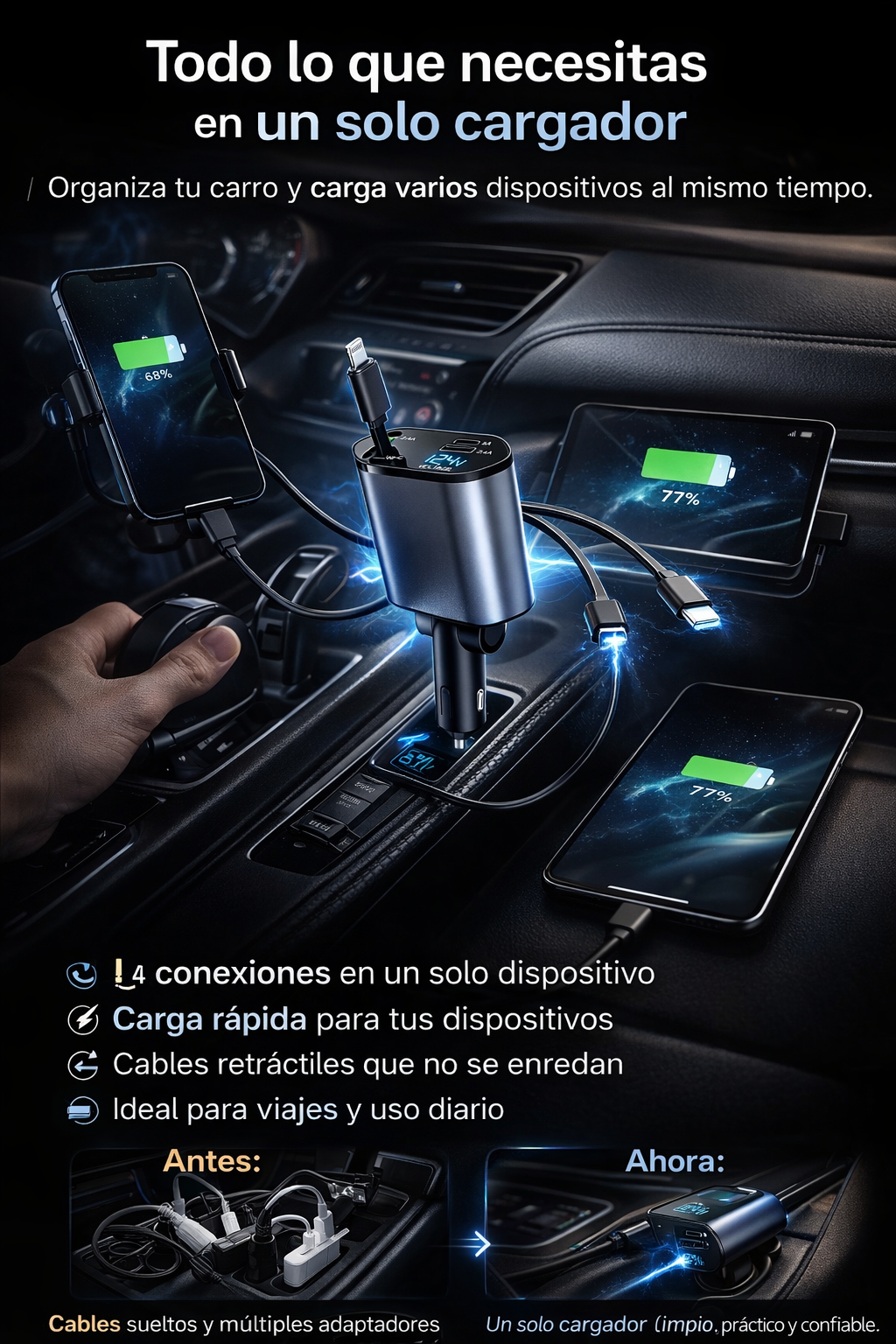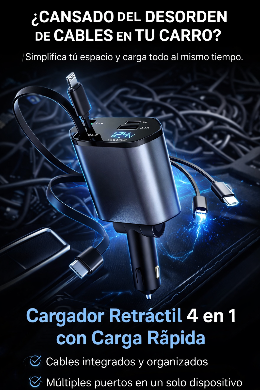 Cargador retráctil para carro 4 en 1 - Carga Rápida 🔋